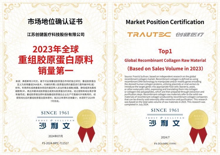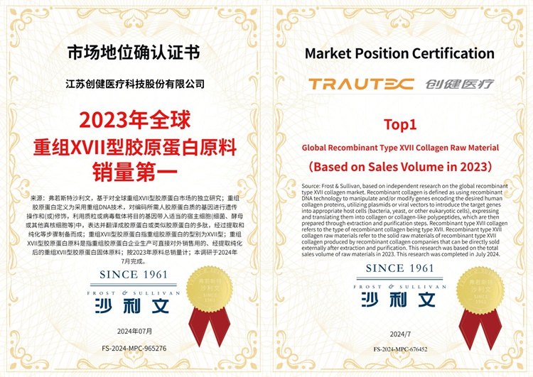 日前,經知名咨詢機構弗若斯特沙利文認證,創健醫療獲得“2023年全球重組膠原蛋白銷量第一”及“2023年全球重組XVII型膠原蛋白原料銷量第一”兩大全球市場地位確認證書,彰顯了創健醫療在重組膠原蛋白行業的領先地位與強勁產品實力。